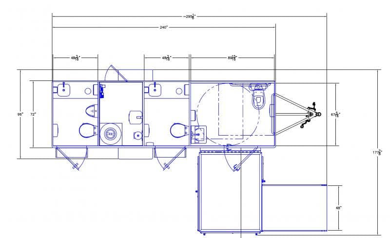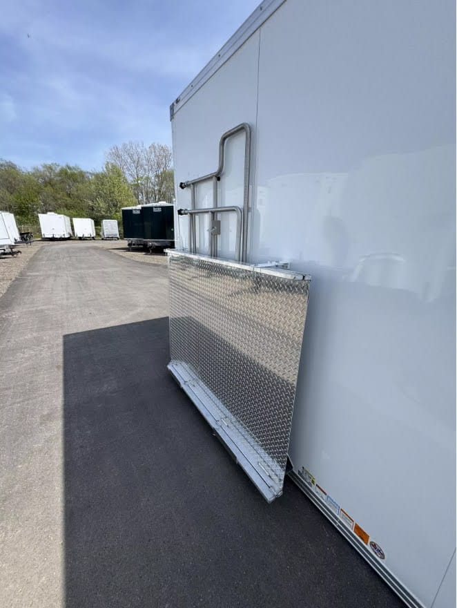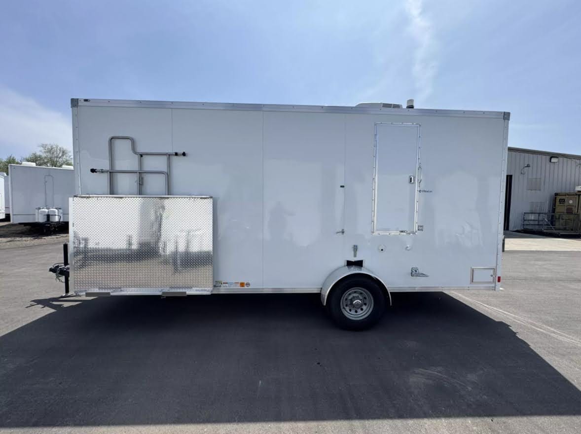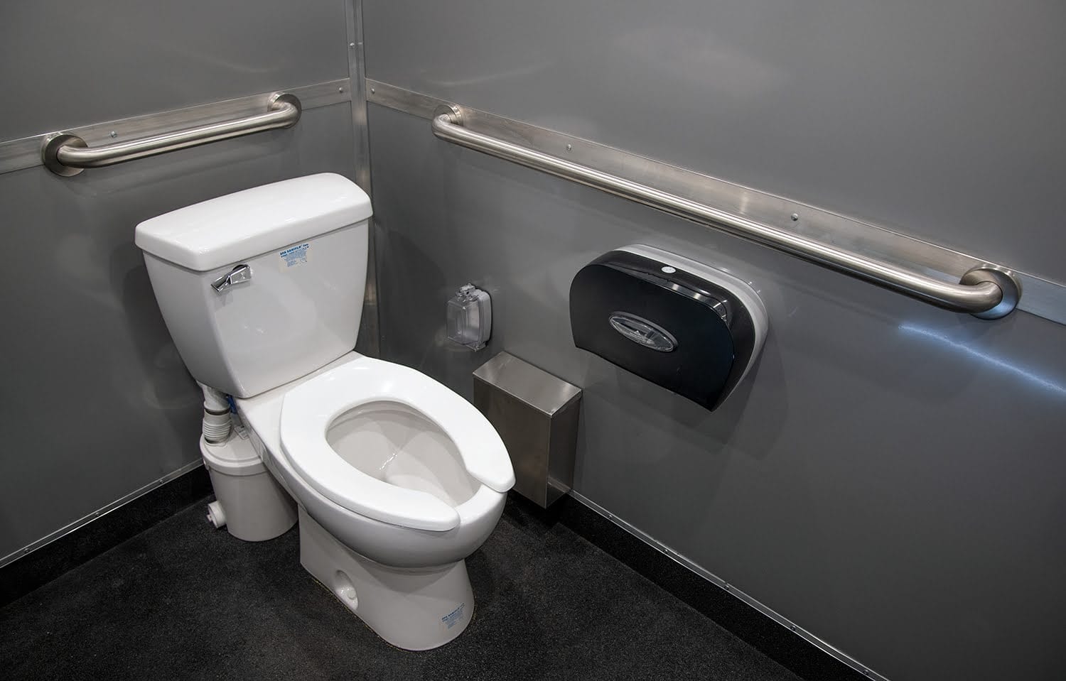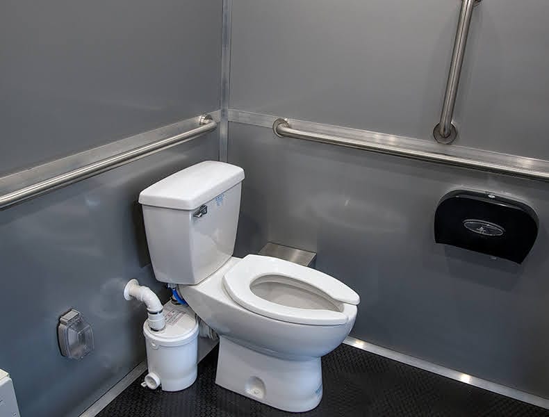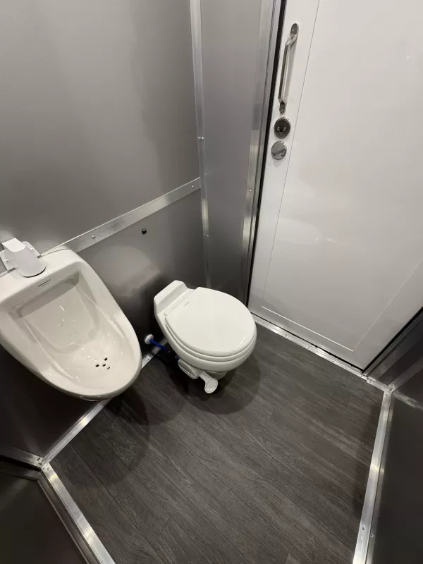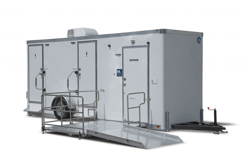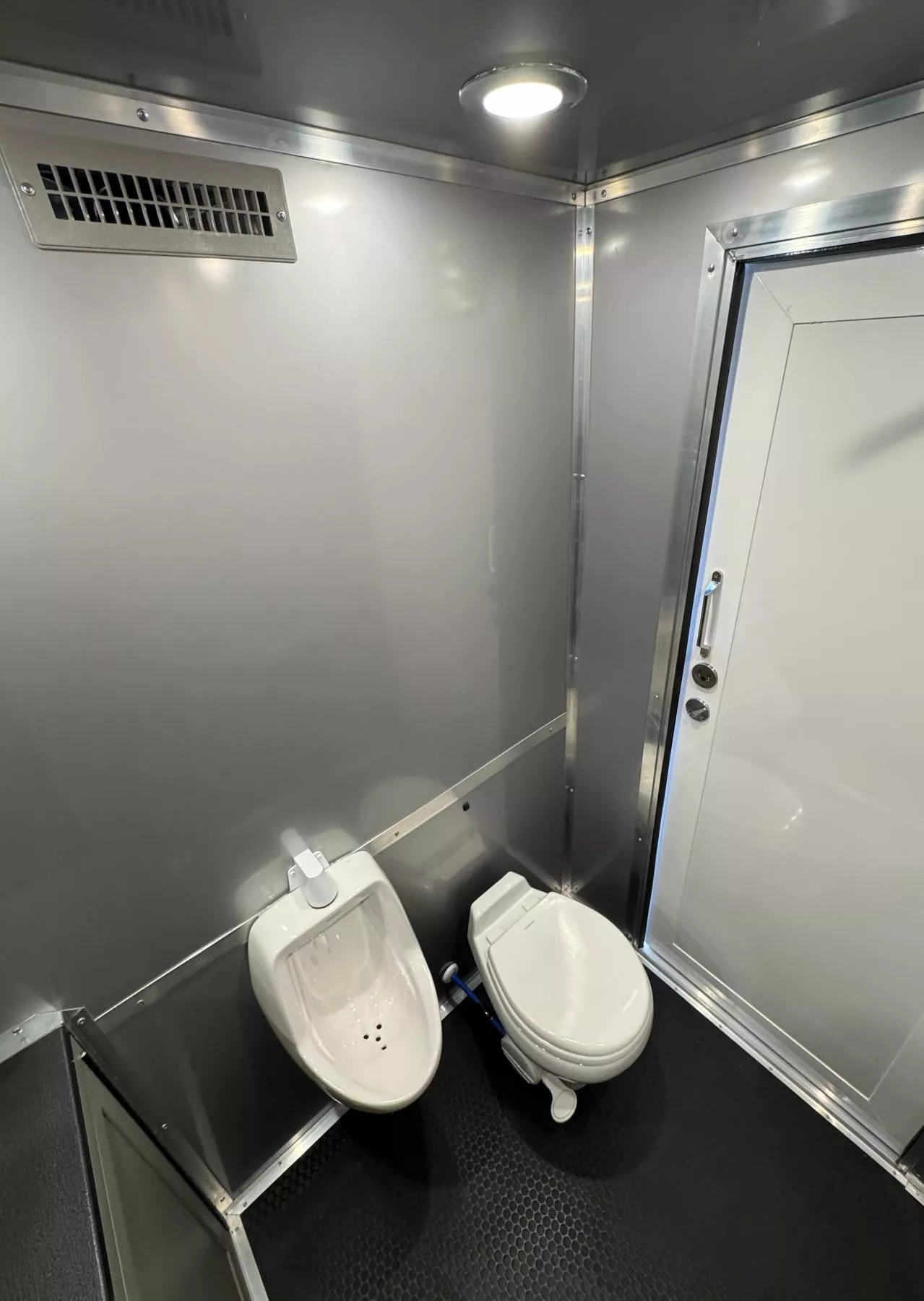 ADA+2 restroom trailer, 20′ x 6′, with aluminum polar white exterior and gray interior walls. Layout includes one ADA compliant room with grinder toilet, ADA sink, and handrails, one men’s room with toilet, urinal, and cabinet base with sink, and one women’s room with toilet and cabinet base with sink. Features LED interior and exterior lighting, roof mount air conditioning unit, electric hot water heater, 105 gallon fresh water tank with city fill connection, 375 gallon waste tank with sight glass, and durable construction suited for event and commercial use.