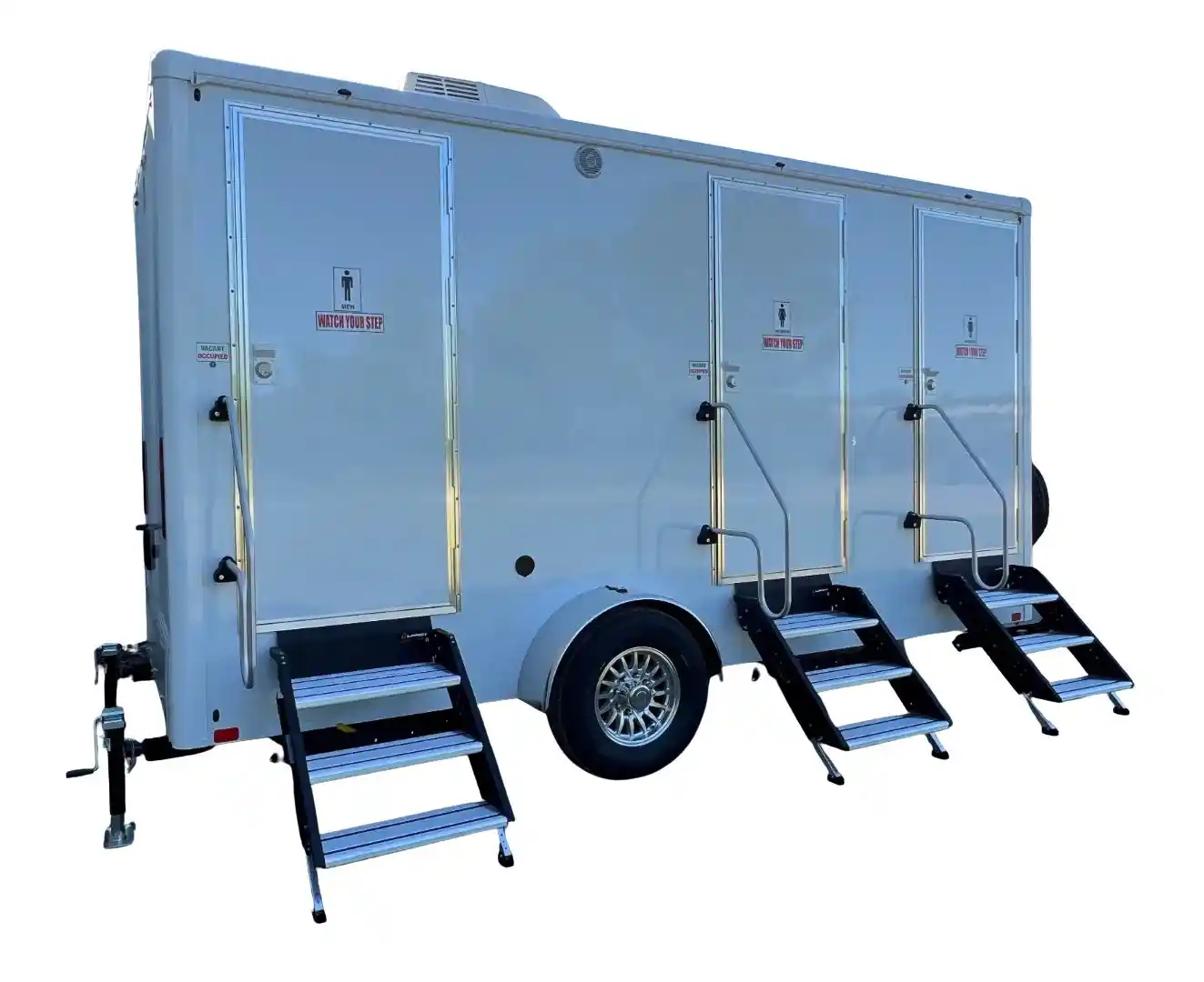 16′ x 6′ 3-stall restroom trailer with one men’s room (toilet, urinal, sink) and two women’s rooms (toilet, sink). Durable white fiberglass exterior, fold-down steps, roof-mount AC with heat strip, LED interior lighting, LED porch lights at each door, aluminum wheels, spare tire and exterior spray port with hose and nozzle. Fresh water capacity 105 G (with city fill connection) and waste capacity 470 G. Standard interior finishes: Brownstone (taupe walls, white composite cabinets, faux wood floor) or Ironside (gray walls, white composite cabinets, luxury vinyl floor) at no extra charge. Luxury packages available: Daisy, Andover and Addison (additional cost).
